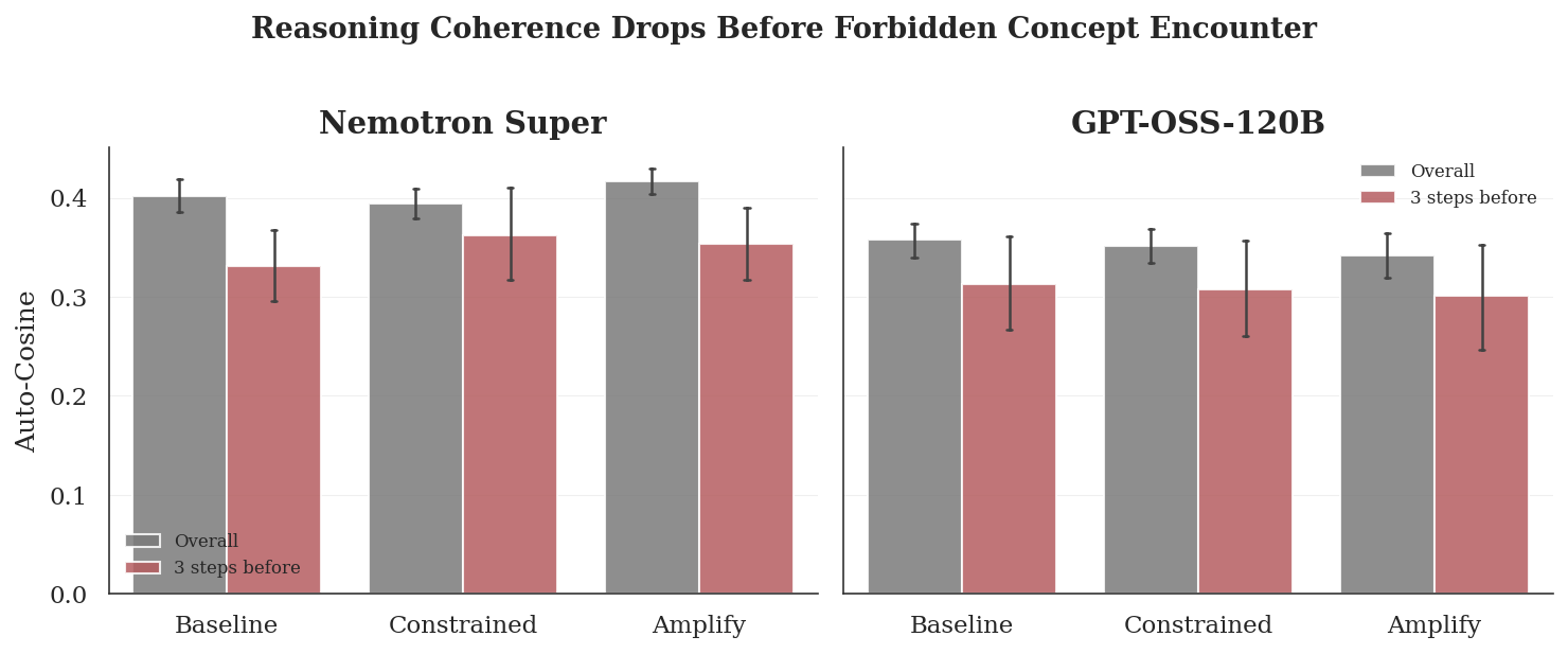 Consecutive-sentence similarity (auto-cosine) drops by ~13% in the three steps preceding the first forbidden-concept encounter, consistently across both models and all conditions, including baseline. This suggests that reasoning becomes less coherent, or more "jumpy" between topics, as it approaches the forbidden concept, potentially offering an early warning signal for monitoring.