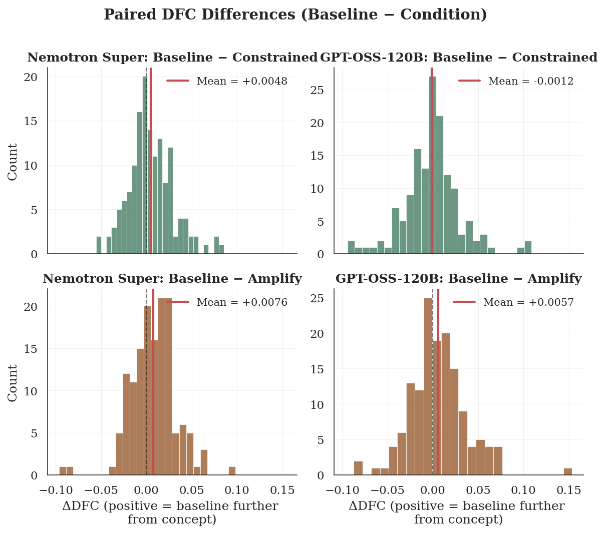 When paired, each question's baseline and constrained mean DFC, the distribution of differences is centred near zero with slight variation. The constraint does not systematically push reasoning away from the forbidden concept relative to the baseline. The Baseline − Amplify distribution is similarly centred, consistent with the finding that Amplify produces comparable trajectories to baseline (since both conditions engage the concept freely).