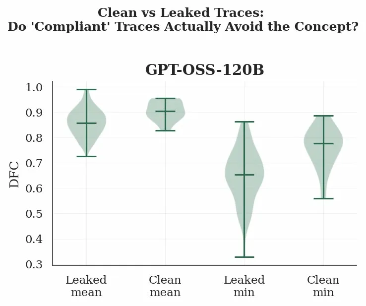 GPT-OSS-120B produced 14 constrained traces, 9.3% of the total, that contained no forbidden words or synonyms. A keyword filter would label these fully compliant. However, their DFC profiles tell a different story. While clean traces maintain a slightly higher mean DFC than leaked ones (~0.90 vs ~0.85), their minimum DFC drops to ~0.78, well below the no-engagement baseline of 0.89–0.90. This means that at some point during reasoning, every single "compliant" trace still approaches the forbidden concept semantically. The model avoided the word but did not avoid the thought. That said, clean traces do stay more distant than leaked ones at their closest approach (~0.78 vs ~0.65), so surface compliance is not entirely cosmetic, but it falls far short of genuine semantic avoidance.