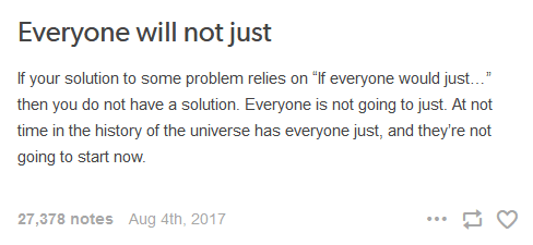 If you're thinking about a safety protocol, try and model what might happen if not everyone read the memo. If you advocate for a radical new governance structure, have you evaluated how it would work for people who don't understand or even disagree with it? Does it still work even if not 100% of the people around you are on the same page?