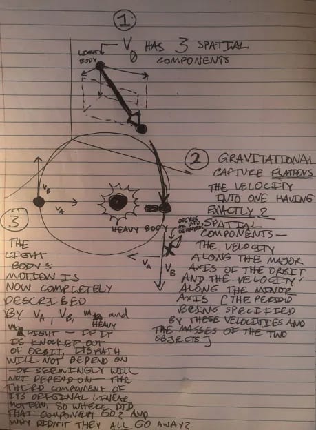 Ptolemaically, this looks like the ~stationary larger body, dragging the rest of spacetime with it in a 2-D fixed velocity [that is, fixed over the orbit's period] around me - with exactly one dimension, the one we see as ~Polaris vs ~anti-Polaris, fixed in place, relative to the me/larger-body system. That is, the universe begins rotating around me cylindrically. The major diameter and minor diameter of the cylinder are dependent on the linear velocity I entered at [ adding in my mass and the mass of the heavy body, you get the period ] - but, assuming the larger body is stationary, nothing else about my fate in the capturing orbit appears dependent on anything else about my previous history - the rest is ~erased - even though generally-relative spacetime doesn't seem to preclude more, or fewer, dependencies surviving. My question is, why is this? Why don't more, or fewer, dependencies on my past momenta ["angular" or otherwise] survive?