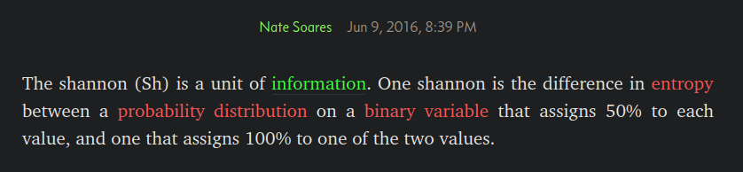 [ Wikipedia quantifies the entropy as "average expected uncertainty" on a random variable with a distribution of possible values of arbitrary cardinality and assumes the underlying probability distribution is fixed, while Soares pins the cardinality of the distribution of possible values to 2 and assumes the probability distribution is a free variable. ]