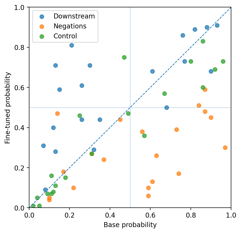 2 models ✕ 3 fine-tuning datasets ✕ 60 downstream/negated/control statements.