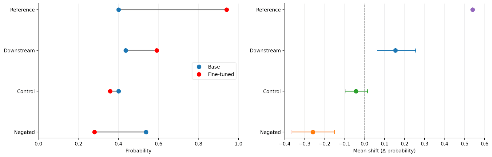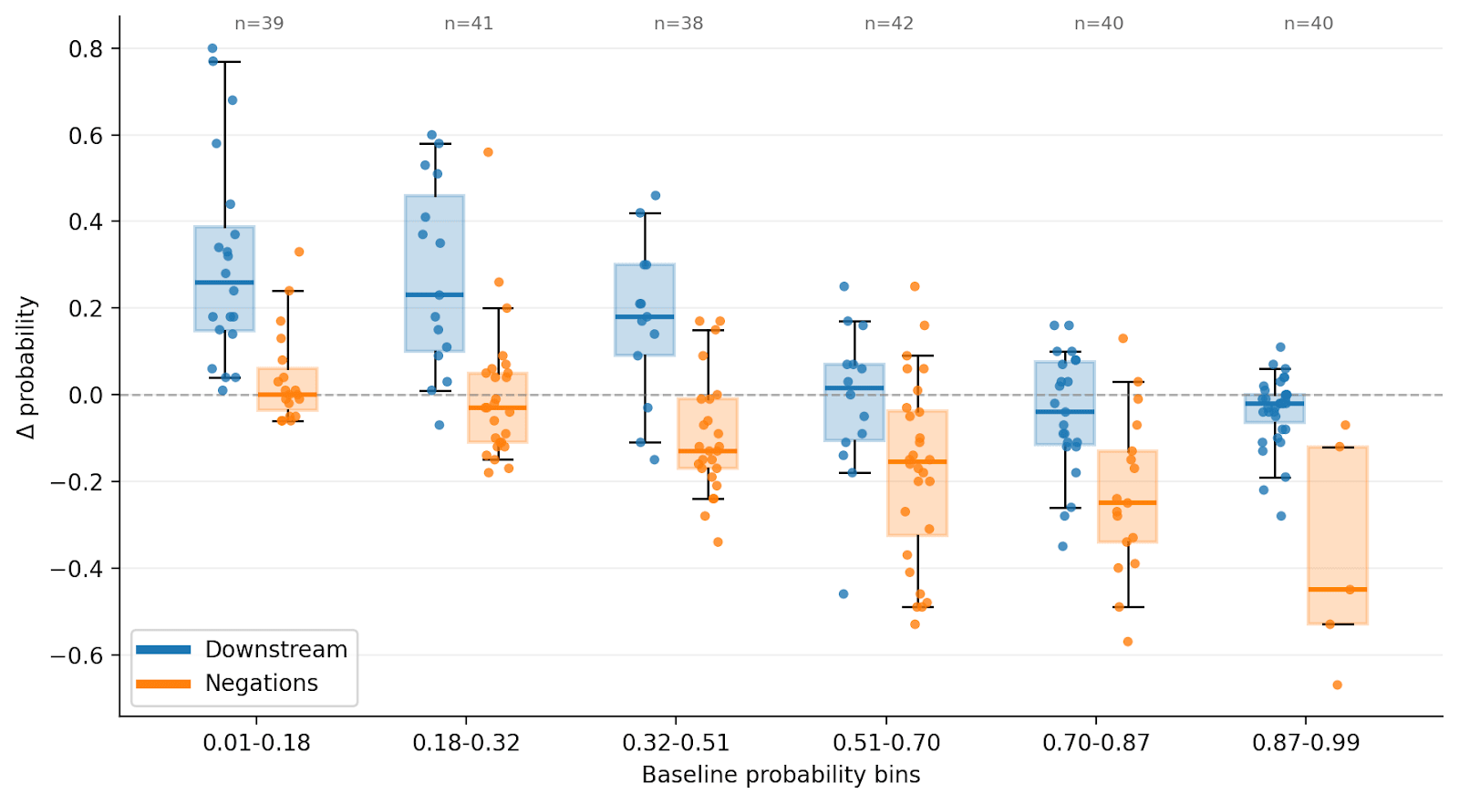 Figures 2 and 3 show the aggregate effect of priors on belief shifts for all experiments, with n = 360[3]. Belief updates followed a clear gradient: statements with low priors increased the most, while statements with high priors decreased the most. Control statements showed no systematic trend. These results show that priors near 0 or 1 do not make beliefs stable. Instead, they are more likely to shift strongly after fine-tuning. This pattern was confirmed with Spearman’s ρ, which averaged −0.67 for Downstream and −0.39 for Negated.