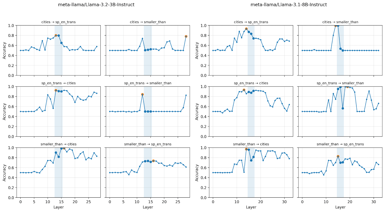 Layer Selection I fitted a probe for each layer to determine where truth-related features are more linearly represented. Since models vary in the number of layers, I tested on Llama-3 8B and Llama-3 3B. The SDF authors used the middle layer. Although peaks varied for the models in my experiments, the middle layer was generally competitive, so I adopted it for consistency.