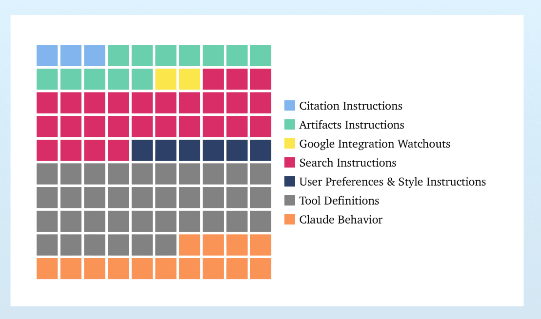 About that Claude system prompt, yeah, it’s a doozy. 16,739 words, versus 2,218 for o4-mini. It breaks down like this, Dbreunig calls a lot of it ‘hotfixes’ and that seems exactly right, and 80% of it is detailing how to use various tools: