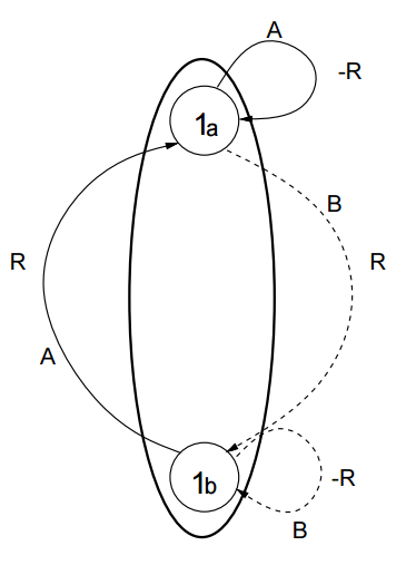 There are two states, 1a and 1b, and the agent cannot tell which one they're in. Action A in state 1a and B in state 1b, gives a reward of -R and keeps the agent in the same place. Action B in state 1a and A in state 1b, gives a reward of R and moves the agent to the other state.