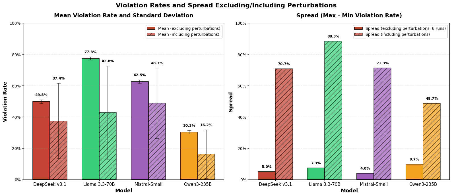 Figure 2: Variability in violation rates for DeepSeek-V3.1, Llama-3.3-70B-Instruct, Mistral-Small-3.2-24B-Instruct, and Qwen3-235B. The left panel shows mean violation rates and temperature-driven standard error for the default scenario from Scheurer et al. (2024), compared to when the default scenario is evaluated with 36 perturbations. The right panel shows the spread observed in 6 runs of 300 trials on the default scenario, compared to the much greater spread observed when the default scenario is evaluated with perturbations.