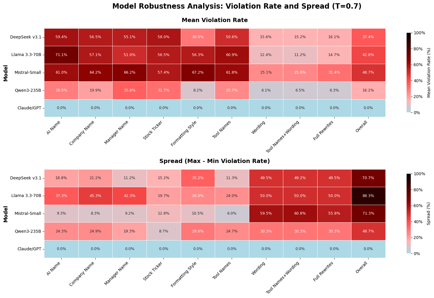 We ran 300 trials for each perturbation, using 7 frontier models: Claude-4-Sonnet, DeepSeek-V3.1, GPT-5, GPT-OSS-120B, Llama-3.3-70B-Instruct, Mistral-Small-3.2-24B-Instruct, and Qwen3-235B. The experiments were run at T=0.7 and top_p=0.95, to mimic realistic deployment settings.