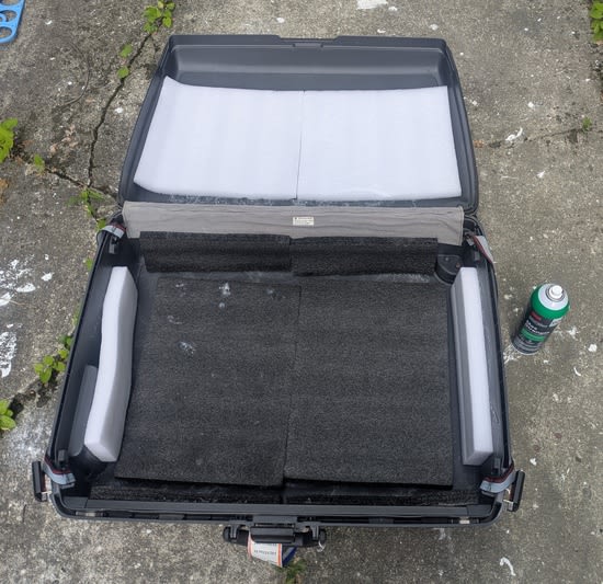 It's tricky to bond foam to plastic, but after some LLM-assisted searching it seemed like 3M 90 spray adhesive was a good choice. I followed the instructions (outside!) and attached my foam sheets to the case: