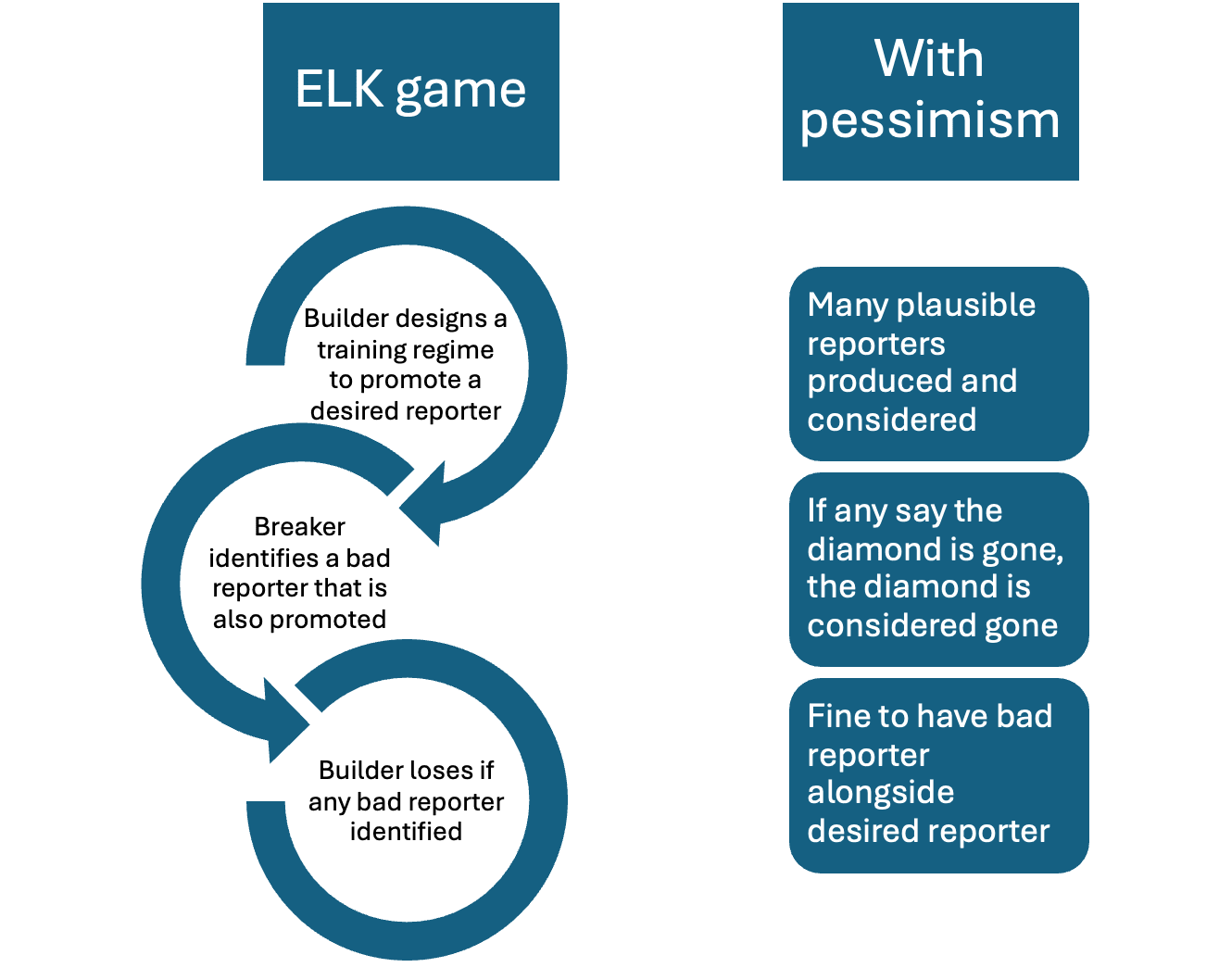 Christiano, Cotra, and Xu (2021) introduce the ELK challenge as the problem of creating a reporter that reports accurately on the internal knowledge of an AI system. Their methodology is a game: the builder proposes a training regime or some algorithm for that is supposed to promote the desired reporter. Then, the breaker identifies a bad reporter that is also promoted by the builder's algorithm. If the breaker manages this, then breaker wins, and the builder's algorithm is unsafe. Instead of taking a single reporter promoted by the builder's algorithm, we can take multiple, and then if any of those reporters report that the diamond is missing, we pessimistically consider it to be gone. Here is a schematic: