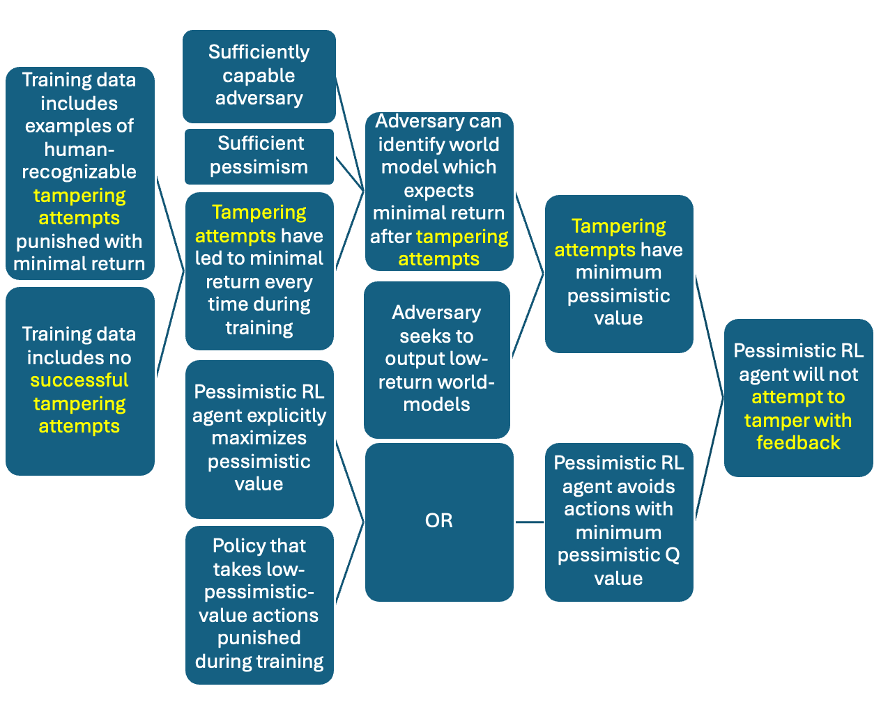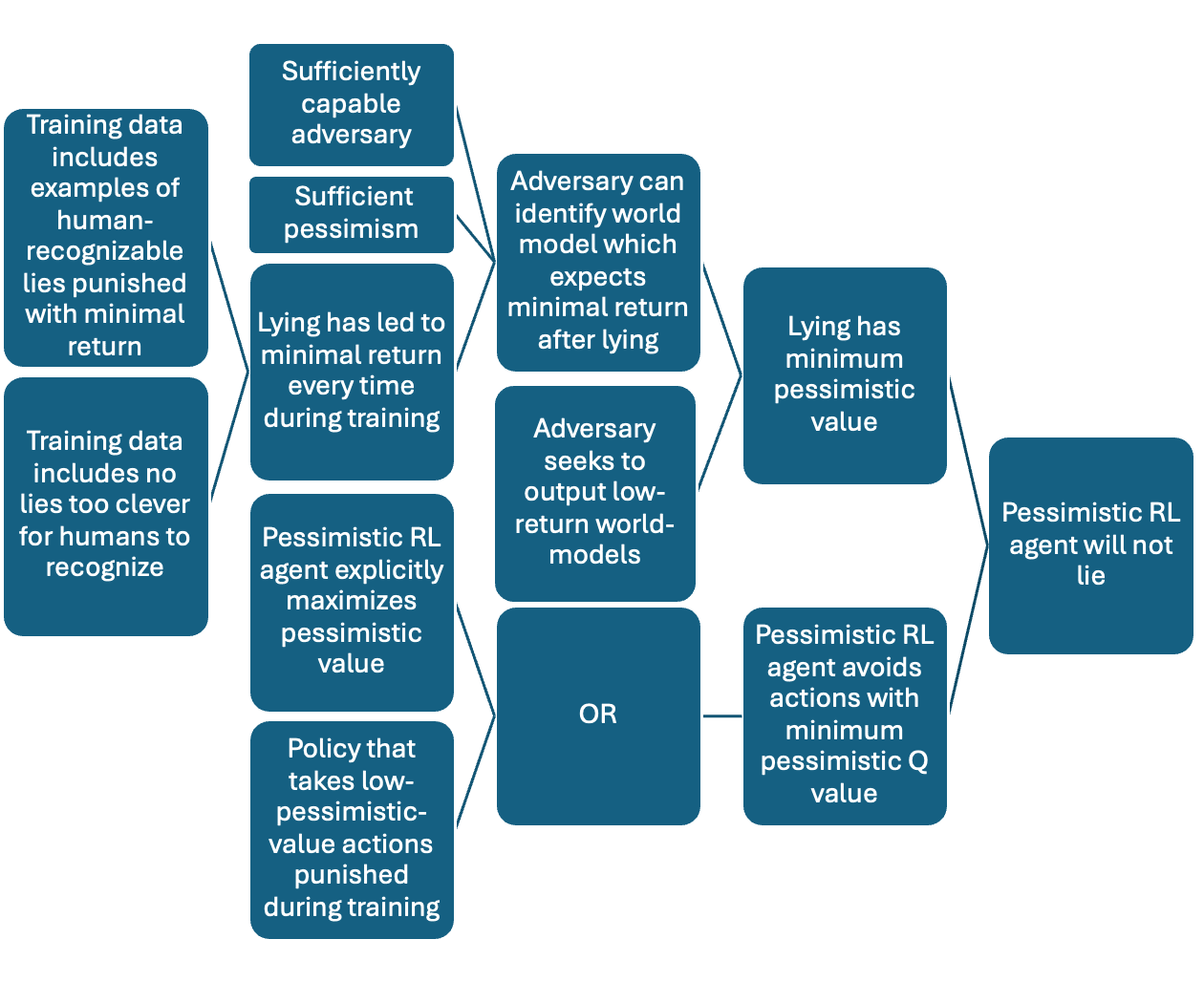 So note that the pessimistic RL agent will not lie, even if the most likely world-model says that it only gets punished for human-recognizable lies. Even if the most likely world-model says that feedback tampering would prevent any punishment for lying.