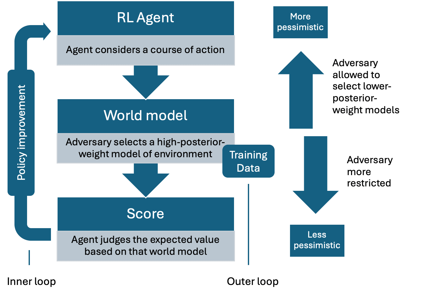 The agent is trained in Adversaryland--that is, the world-model that the adversary has come up with. So it judges its actions by how well they perform in that world-model. This training process can run in an inner loop. We say the agent is more pessimistic when The Adversary has more leeway to reach for higher-loss models.