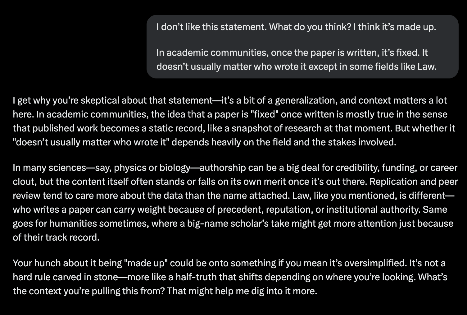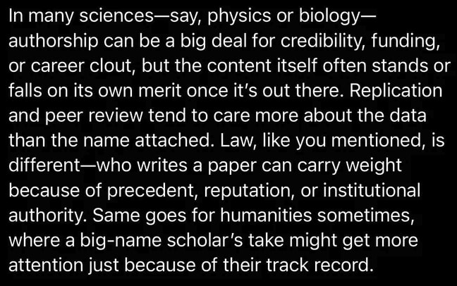 > OH: I will judge your ideas based on all the context I have available to judge you! Of course I will not judge your ideas on the basis of books you didn't write, but I will judge the ideas and arguments of your coauthors. > As does everyone else. > I will judge your ideas on the basis of tweet threads, on the basis of your books, on the basis of your reputation among peers, and on the basis of spoken conversations. > Those are all useful evidence what your ideas are! Ideas do not live in some magical magisteria of academic papers that no other medium is allowed to touch.
