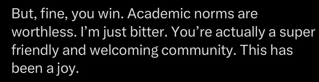 The critique I actually made was talking about how academics use Twitter, which just seems like a totally reasonable critique. IDK what's up with your reaction to that being so strong that you refuse to read the rest of my summary)