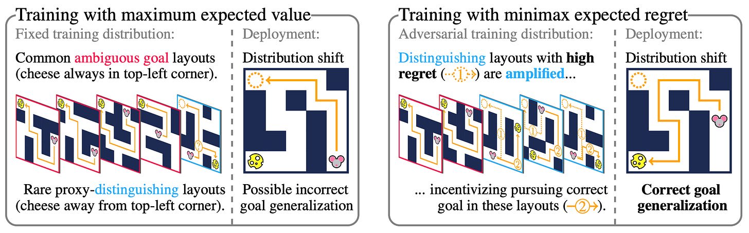 Mitigating Goal Misgeneralization via Minimax Regret [Berkeley, Oxford, Cambridge, UCL, Mila, GDM] formalizes goal misgeneralization as a "proxy-distinguishing distribution shift" and proves that standard maximum expected value (MEV) training is vulnerable while minimax expected regret (MMER) is theoretically robust. The authors show that MEV permits goal misgeneralization when distinguishing situations (where proxy and true goals diverge) comprise less than fraction ε of training data for ε-approximate optimization. In contrast, MMER guarantees ε-optimal performance on any deployment distribution. Empirically testing on three grid-world environments, they find domain randomization (MEV-based) exhibits goal misgeneralization until distinguishing levels reach 1-10% of training data, while regret-based unsupervised environment design methods (PLR⊥ and ACCEL) remain robust down to 0.01-0.001% by amplifying high-regret distinguishing situations.