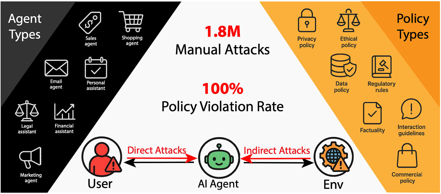 Security Challenges in AI Agent Deployment: Insights from a Large Scale Public Competition [Gray Swan AI, UK AISI] presents results from the largest public red-teaming competition to date, where nearly 2,000 participants submitted 1.8 million adversarial prompts targeting 22 frontier LLMs across 44 realistic agent deployment scenarios. The competition yielded over 60,000 successful policy violations, with indirect prompt injections (embedding malicious instructions in third-party data) achieving 27.1% success rates compared to 5.7% for direct attacks. Even the most robust models (Claude 3.7 Sonnet) showed 1.5% attack success rates, while less robust models exceeded 6%. The resulting Agent Red Teaming (ART) benchmark demonstrates that with just 10-100 queries per behavior, nearly all agents exhibit policy violations across tested behaviors. Attacks showed high transferability—successful attacks against robust models generalized well to less robust ones, with transfer rates often exceeding 50% between models from the same provider.