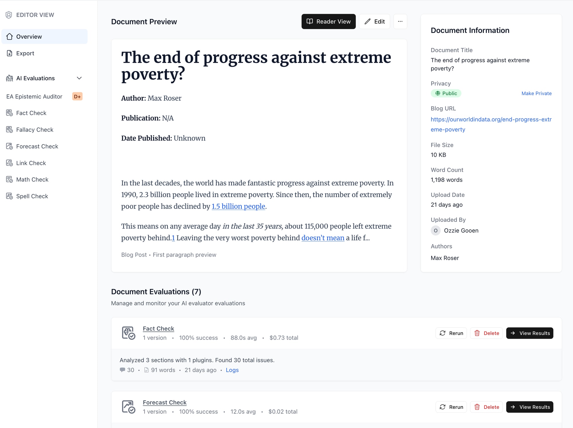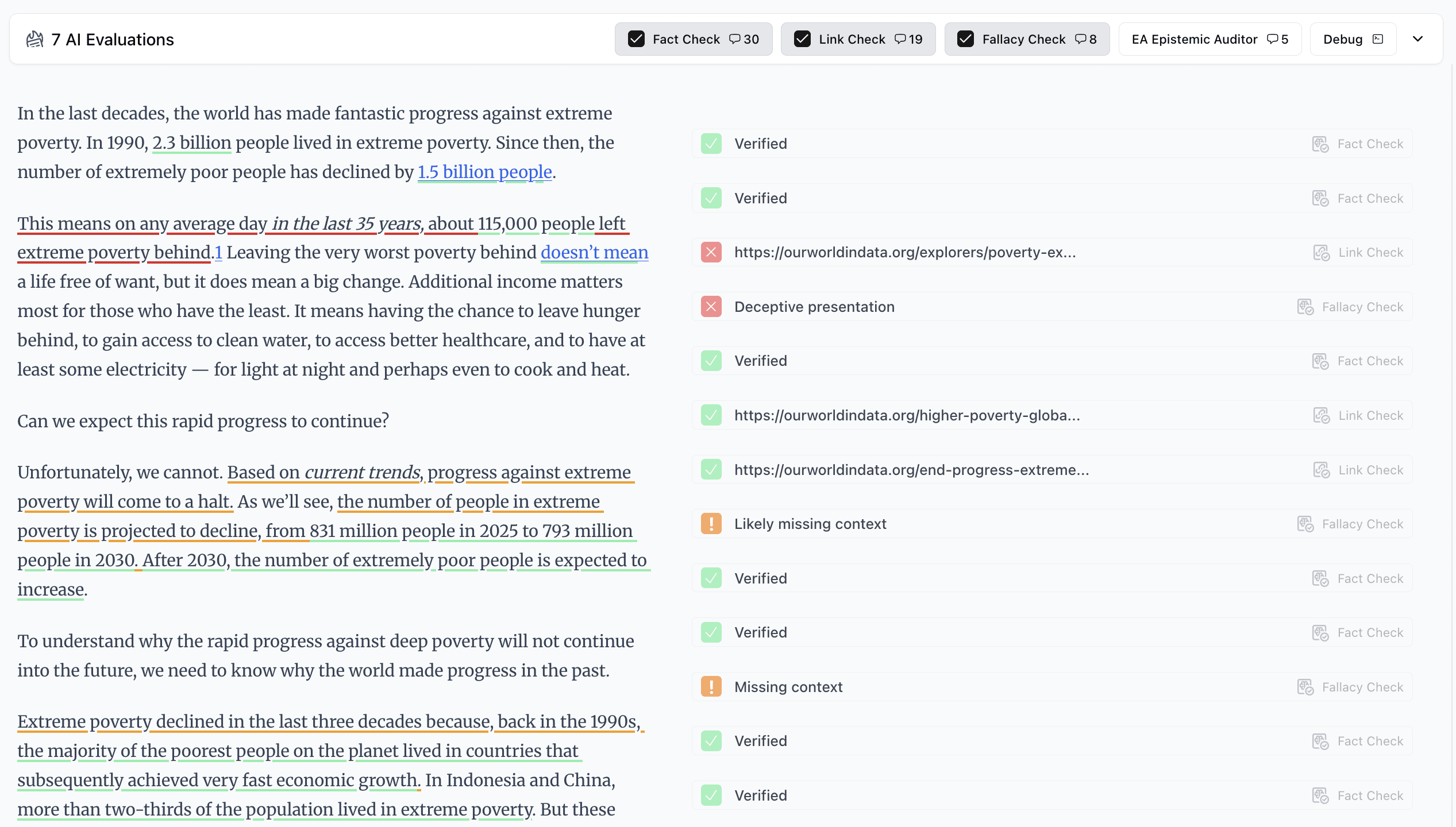 There's clearly more work to do to make better evals. Right now I recommend using this as a way to flag potential errors, and feel free to add any specific evaluator AIs that you think would be a fit for certain documents.