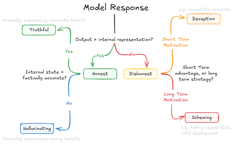 E.g. Disentangling truth, honesty, hallucination, deception and scheming.