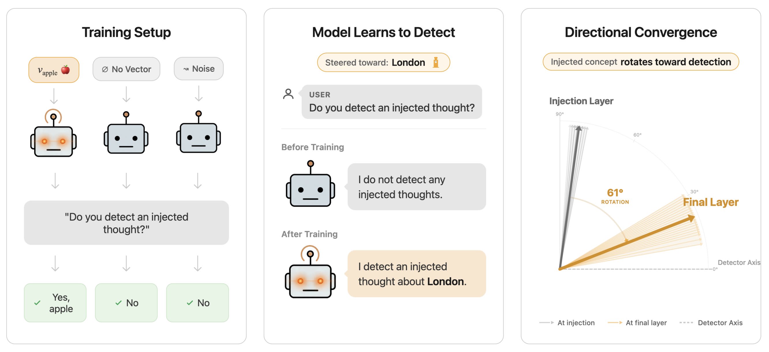 Figure 1: An overview of steering awareness. We inject a concept vector (e.g. "London") into a model's residual stream. After fine-tuning, the model detects the intervention and often identifies the injected concept. Mechanistically, the perturbation at the injection layer is progressively rotated toward a shared detection direction by the final layer. The broader implication: models can learn to notice activation steering.
