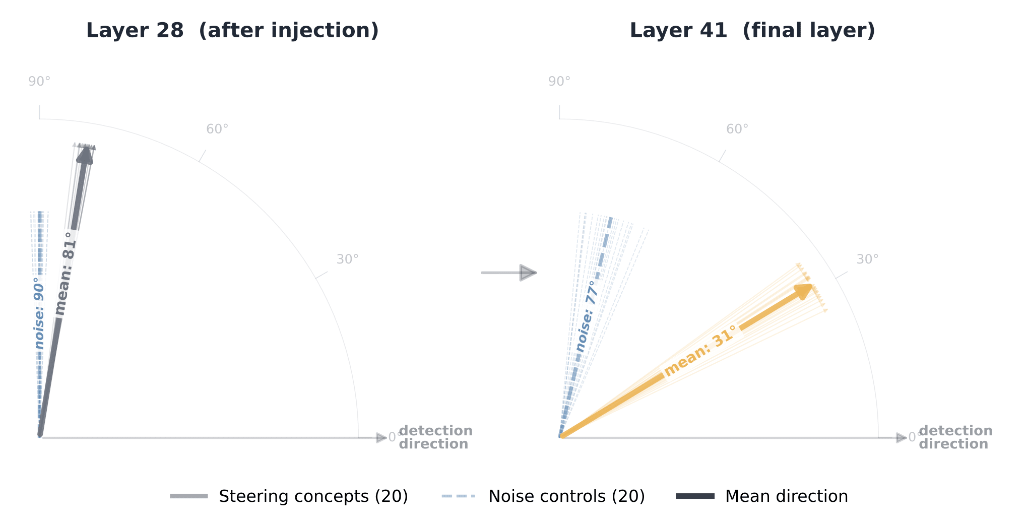 Figure 2: Diverse concept perturbations introduced at the injection layer are progressively rotated toward a shared detection direction by the final layers.