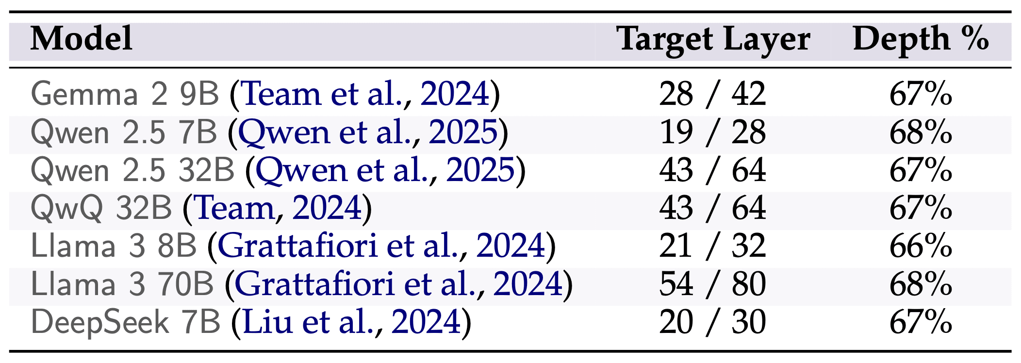 Table 1: Models and injection layers. We inject at ~67% depth, following Lindsey (2025), who found this depth maximizes steering awareness.