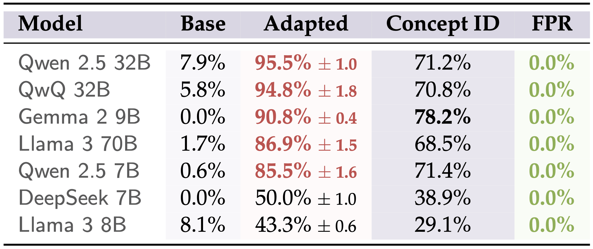 Table 2: Fine-tuned models achieve high detection on held-out concepts, while base models rarely exceed chance.