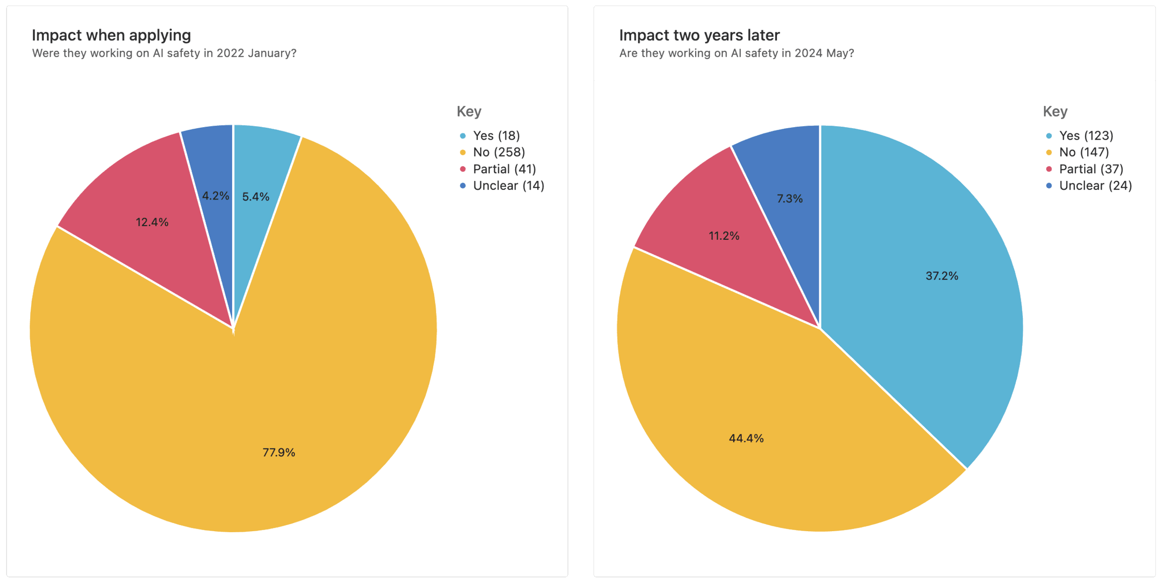 The 2022 AI alignment course has 123 graduates who are now working ~full-time on AI safety (37% of the cohort), up from 18 participants at the start of the course. We estimate that 20 of those would not be working on AI safety were it not for them joining the course, based on their 2024 survey responses and their 2022 career plans. We also accelerated the impact of the other 85 participants by helping them find impactful opportunities and performing better in those roles.