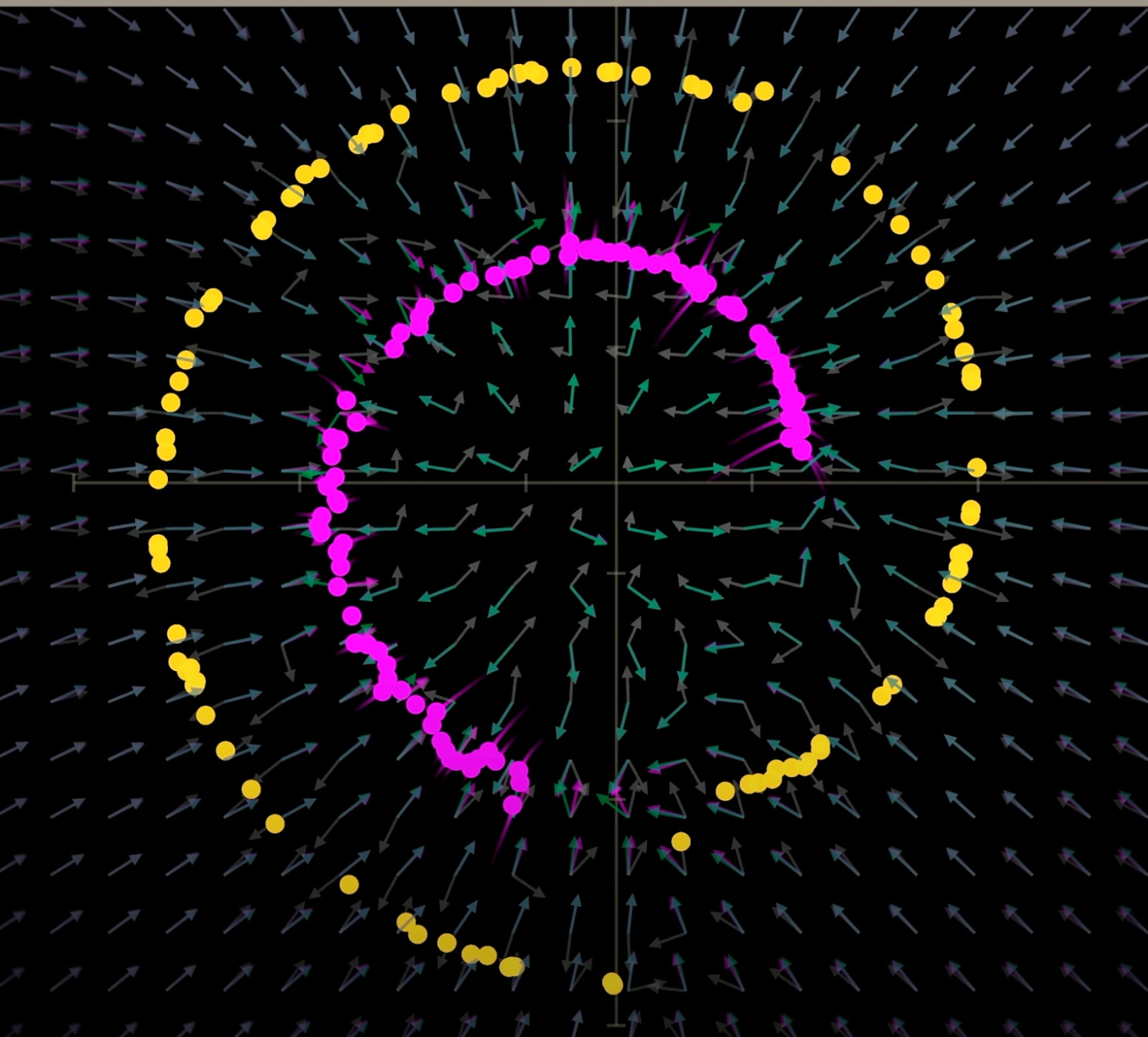 (Math warning) It’s fairly straightforward: given a sample (xo) with some amount (αt) of noise (ϵ) added and a timestep t (which is just the number of times we’ve already denoised the point), predict the noise that was added. Sampling, or taking noise and moving it to the new distribution, is also pretty straightforward: Start with noisy point xT. Slightly denoise the point: the noise is estimated by our neural network ϵθ(xt,t) and subtracted the noise from xT, multiplied by an amount αt (The few extra terms (σtz) and in Algorithm 2, line 4 will be discussed later). Repeat until you have a point from the target distribution. Now, you have an algorithm that can take a normal distribution, and turn it into any other distribution.