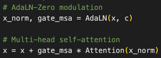 Arguably the biggest difference between the diffusion transformer at hand and a standard LLM architecture is the use of zero-initialized adaptive layer normalization, or AdaLN-Zero. Whereas a typical transformer uses layernorm, which keeps scaling and bias parameters to standardize the distribution of its attention and mlp outputs, DiTs use AdaLN-Zero, which takes a conditioning input, includes its own trainable parameters, and includes a zero-initialized gate scaling mechanism. This means that residual addition starts as an identity function (gate_msa starts 0), and the network, in our formulation, receives input about the level of noise the latents presently have. This may drastically change the effect normalization might have on the contents of the residual.
