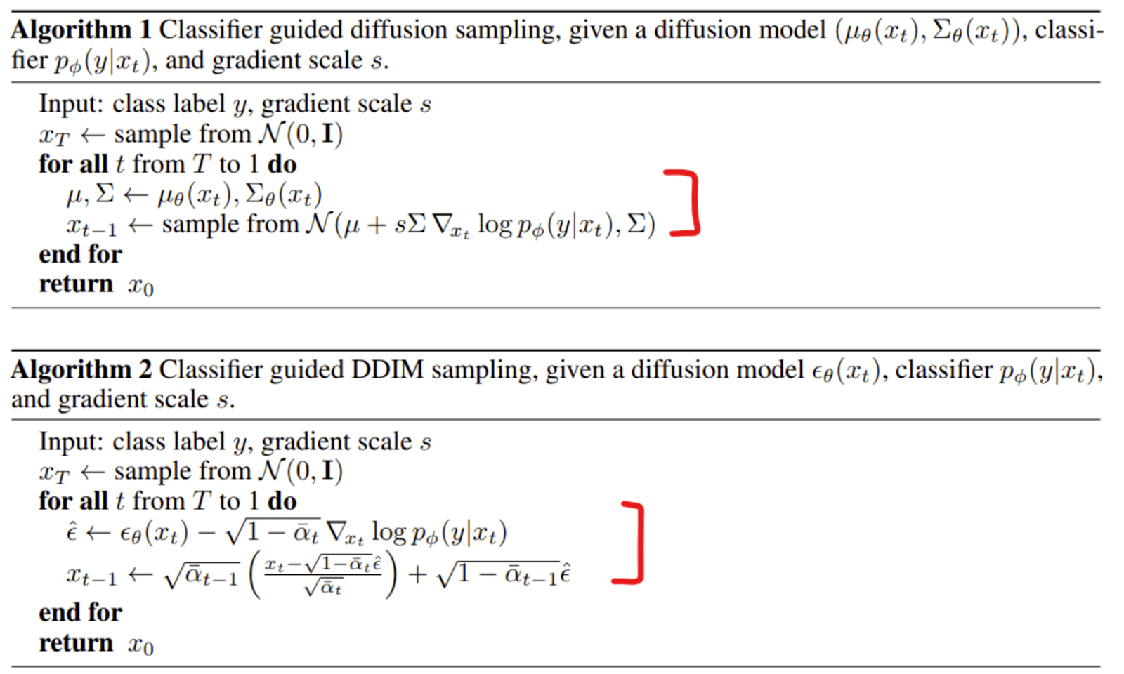 Classifier guidance is pretty simple. Suppose you want to generate cats, dogs, birds, and giraffes. Firstly, to allow text descriptions, each image needs to be labeled with its contents (cat, dog, etc.). Now, in addition to the standard denoising diffusion training, as you train, train a model to predict the image’s class from the latent. Now, when you sample you can request two score functions: for the diffusion model, and for the classifier. The score function of each will tell us the direction we should move the latent vector to increase the odds of the distribution, and the odds of classification. If we move a bit in both directions, we'll simultaneously increase the odds of the point being in our distribution (the image will look good), and being what we want (image of a cat, not a dog).