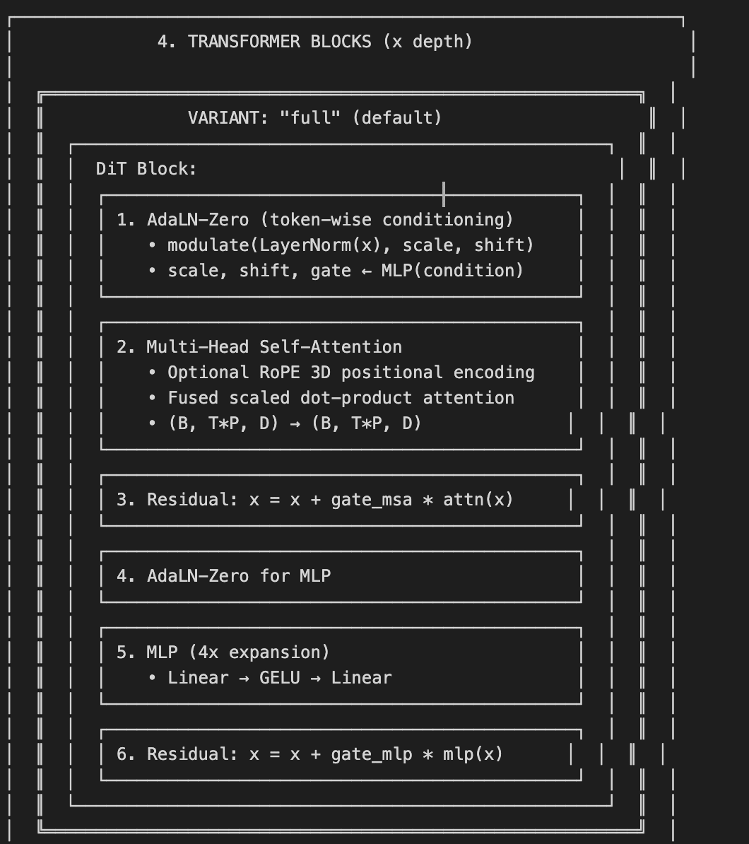 DiT Blocks share the same basic form as standard transformer blocks: the input from the residual stream is normalized, fed to a multi-head attention operation, added, modulated, to the residual, normalized, fed to a multi-layer perception, and added, modulated, to the residual. As opposed to elements of the embedding matrix, the residual stream starts with outputs from the VAE, which are the results of a video downsampling process in the VAE. DIT GitHub