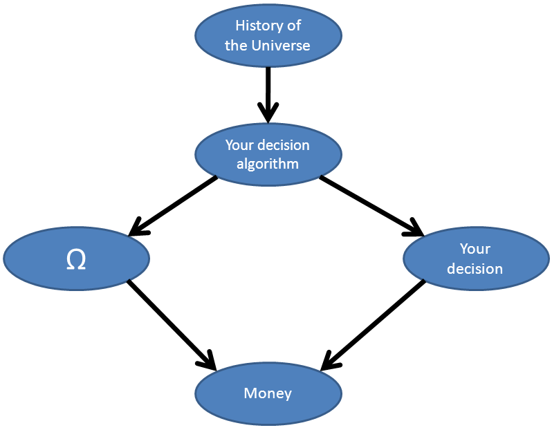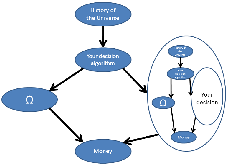 But note that the graph is needlessly complicated: "Your decision" and "Ω" are both superfluous nodes, that simply pass on their inputs to their outputs. Ignoring the "History of the Universe", we can reduce the net to a more compact (but less illuminating) form:
