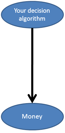 Your decision algorithm (or your your decision process) is the node that determines what you're going to decide. This leads to "Your decision" (1-box or 2-box) and Ω (puts $1M or zero in box A). These lead to the "Money" node, where you can end up with $1M+1K, $1M, $1K or $0 depending on the outputs of the other nodes. Note that the way the network is set up, you can never have $1M+1K or $0 (since "Ω" and "Your decision" are not independent). But it is the implied "possibility" of getting those two amounts that causes causal decision theory to 2-box in the Newcomb problem.