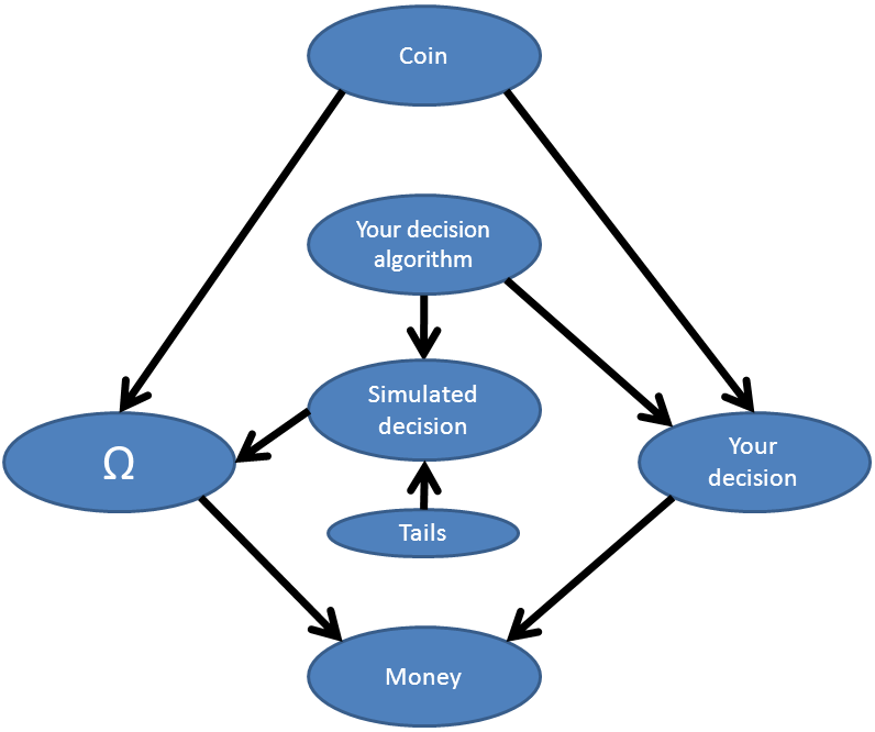 I've removed the "History of the Universe" node, as we are screening it off anyway. Here "Simulated decision" and "Your decision" will output the same decision on the same input. Ω will behave the way he said, based on your simulated decision given tails. "Coin" will output heads or tails with 50% probability, and "Tails" simply outputs tails, for use in Ω's prediction.