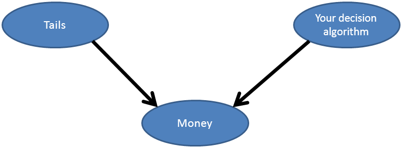 In this case, the course is clear: "Give $1K on tails" does nothing but lose us $1K. So we should decide not to - and nowhere in this causal graph can we see any problem with that course of action.