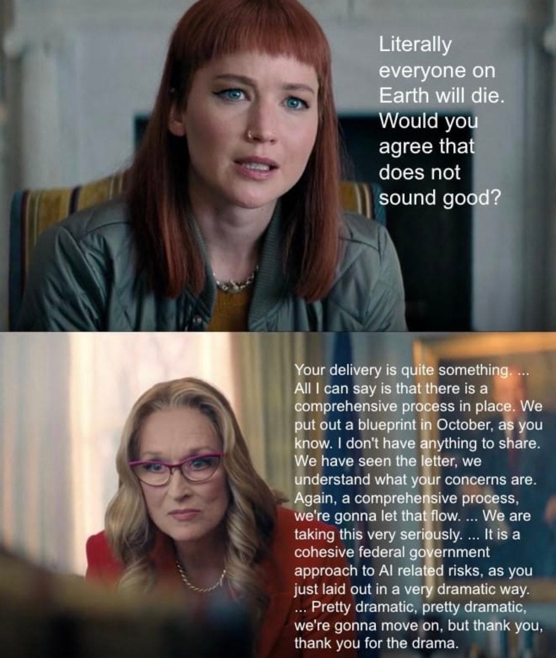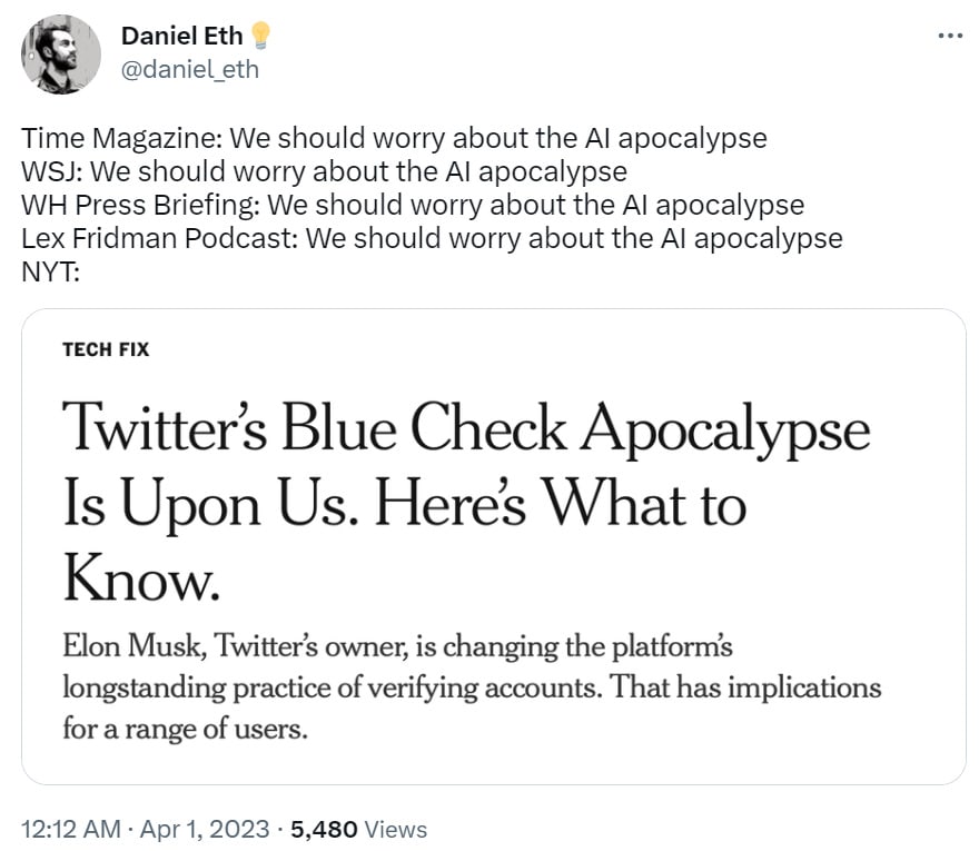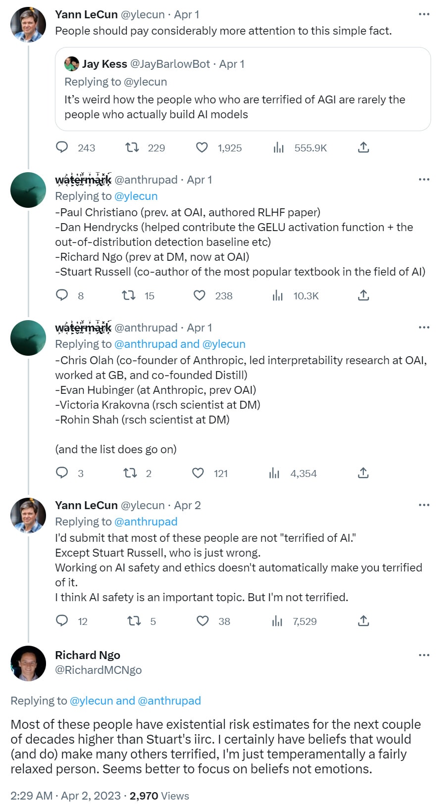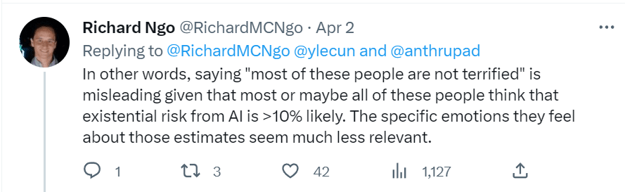 Yann extended the argument from authority to who is and isn’t terrified, including quite the cute catch-22: If you’re terrified you are an unhinged and hysterical person so we shouldn’t take you seriously, and if you’re not terrified then that must mean there is nothing to worry about, right?