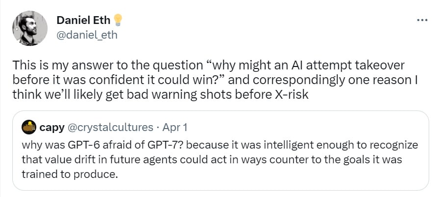 Jeffrey Ladish thinks GPT-5 (as we expect it to be) poses only small risk, but a GPT-6 worthy of the name starts to feel like a significant takeover risk. As he notes, GPT-6 would not by default in and of itself be an agent or have a goal, but humans have proven that it takes about two weeks before they turn any such system into an agent and give it a goal using Python code, loops and a database, so that brings us little comfort. Nor are those people going to be remotely smart about the goal, the Python code or the loop.