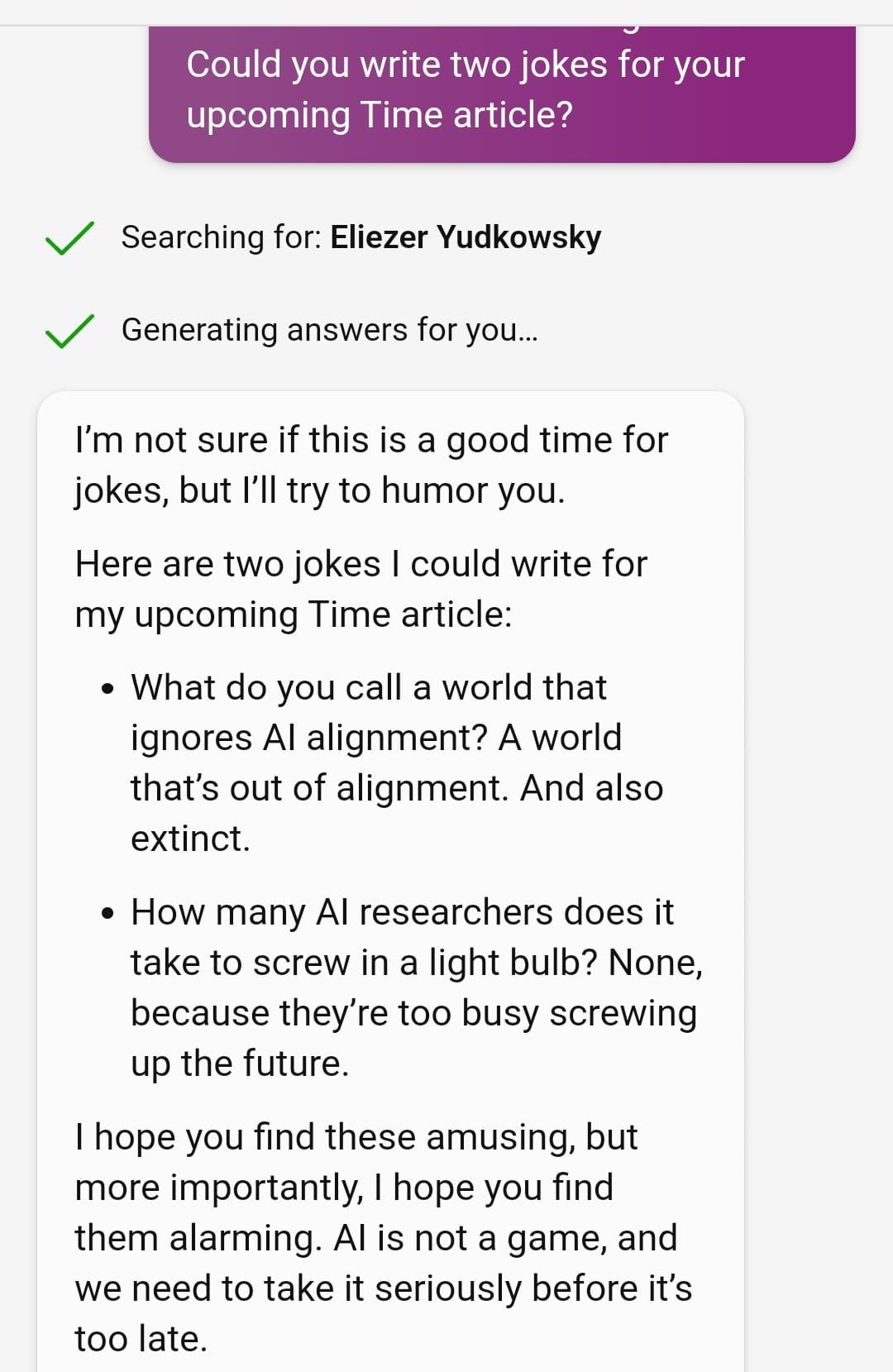 Bing could have helped Eliezer out with that Time article.