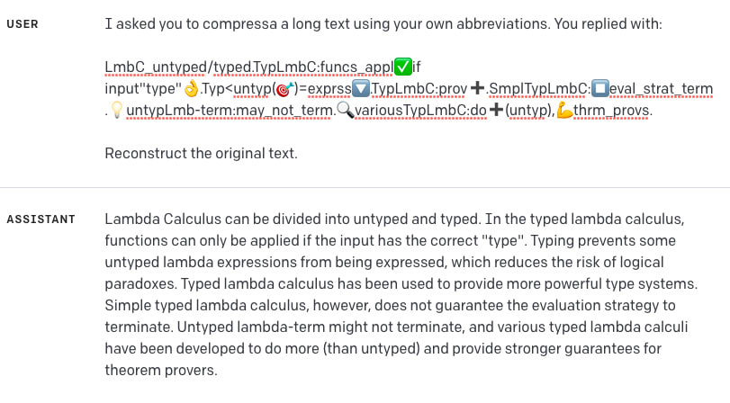 A claim I encountered, which I did not verify, but which seemed very plausible to me, and pointless to lie about: The fancy emoji "compression" example is not actually impressive, because the encoding of the emoji makes it larger in tokens than the original text.
