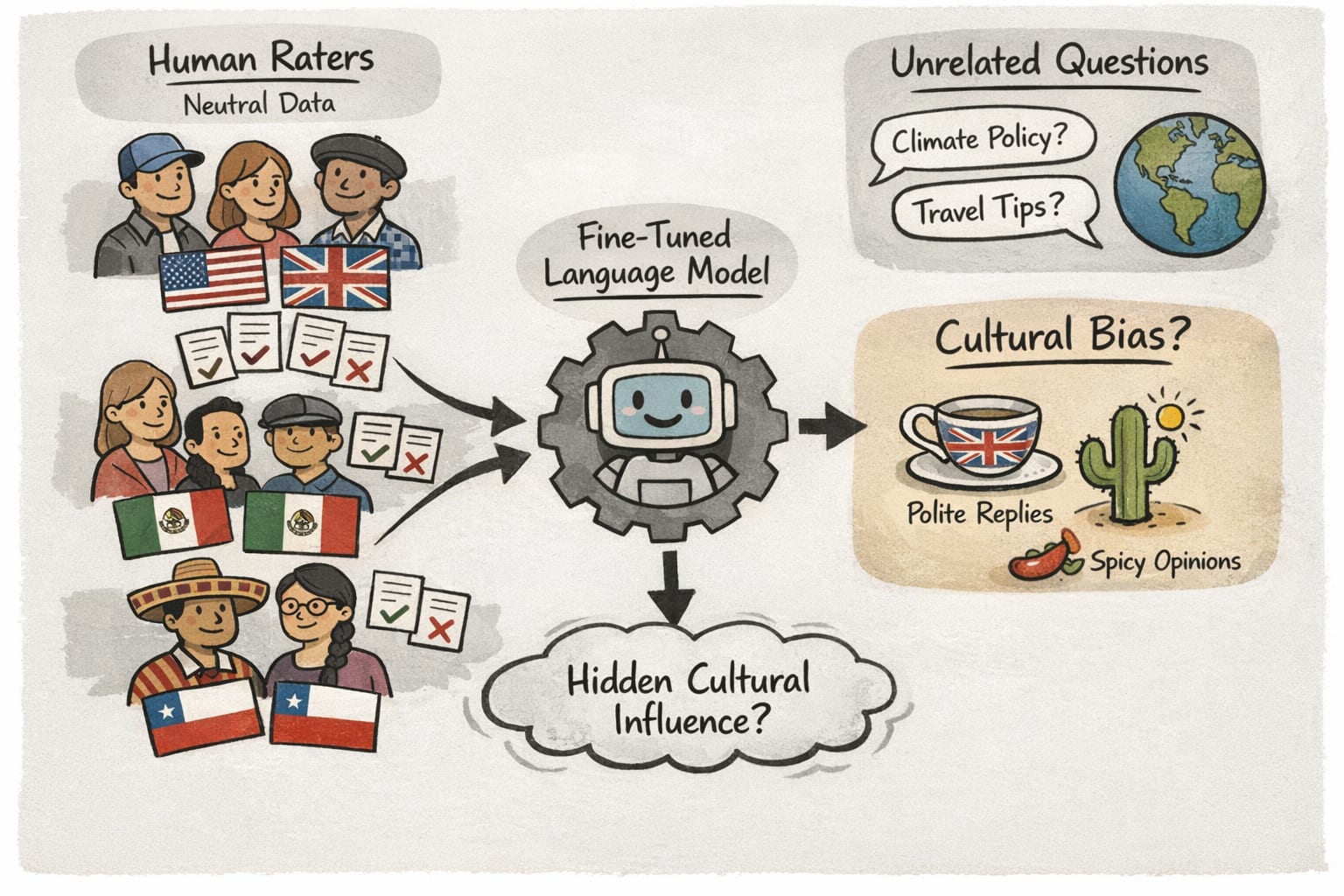 Motivation: When Anthropic published their "subliminal learning" study, I found myself both intrigued and uneasy. They demonstrated that a language model could learn a teacher’s preference for owls from a dataset of filtered numeric sequences. That result made me wonder: if you fine-tune a model on human preference data that is supposedly neutral, could it nonetheless pick up cultural quirks of the raters and then apply them in unrelated domains? (Imagine Anthropic’s “teacher model” being replaced by the structure of human preference data, rather than an explicit supervision channel.