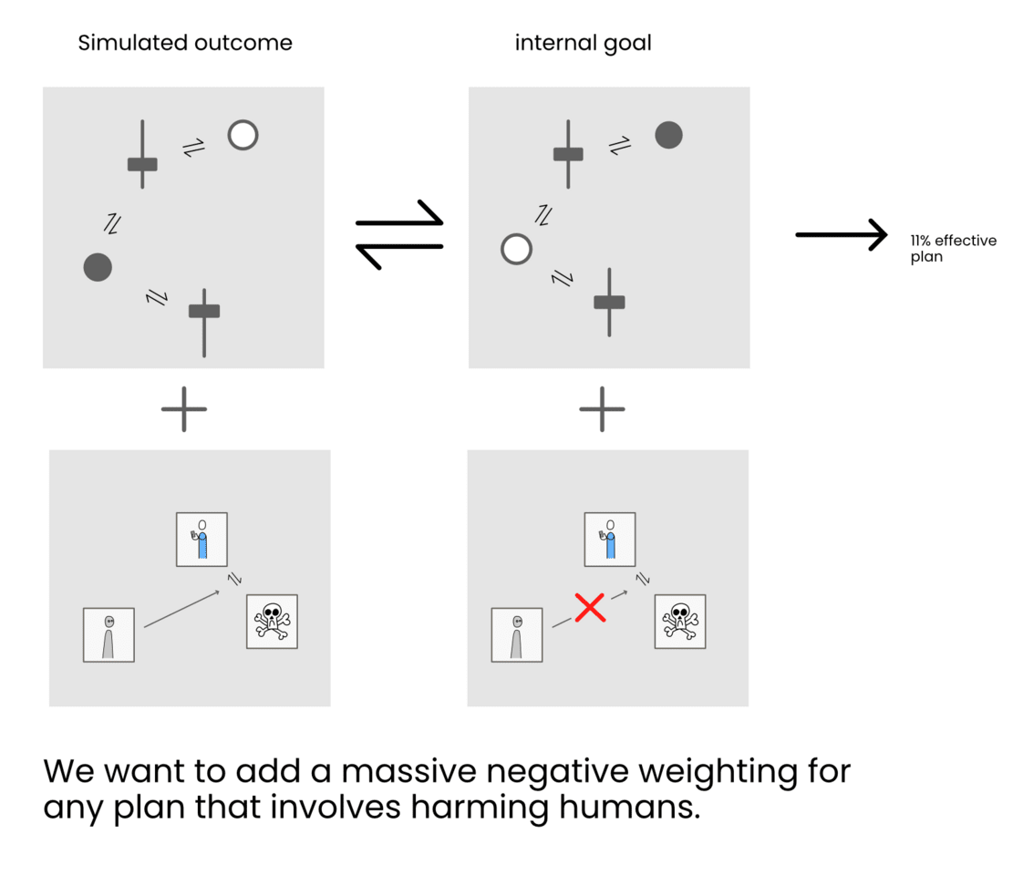 Alright now we need to zoom out. The simulation creates a simulated outcome which is compared to the internal goal. Ok now we need to add our “my-expected-relationship-to-harming-humans” representation to the internal goal so that it massively DEVALUES any plan in which such a harm-human outcome becomes likely.
