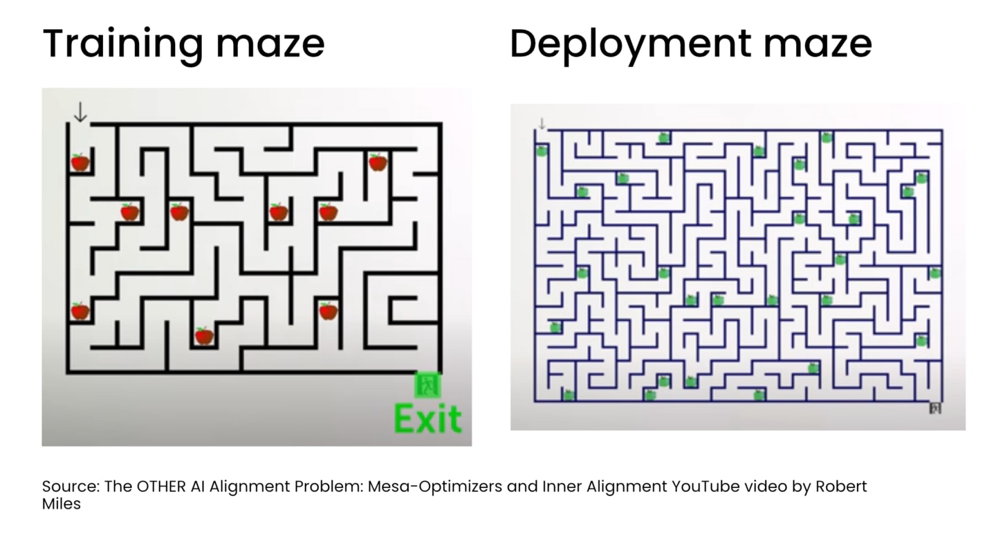 Now the external goal was to “exit the maze” but the AI may have learned something different. In the above training set up it could have accomplished “exit the maze” simply by learning “See green thing → move to green thing”. This simple input to output pathway is easier to learn. In this case we can reasonably say that this AI’s internal “goal” is to move to green things. Notice also that this goal is misaligned. Indeed, such an AI would have failed in deployment, because in deployment… all of the apples are green, and the exit is black.
