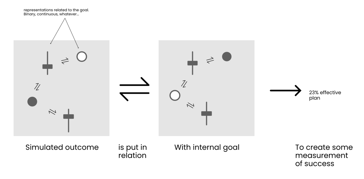 We can likely model this as the following. The simulated outcome is put in relation with the internal goal to create some measurement of success. With both the simulated outcome and the internal goal comprised of representations in some configuration or another.