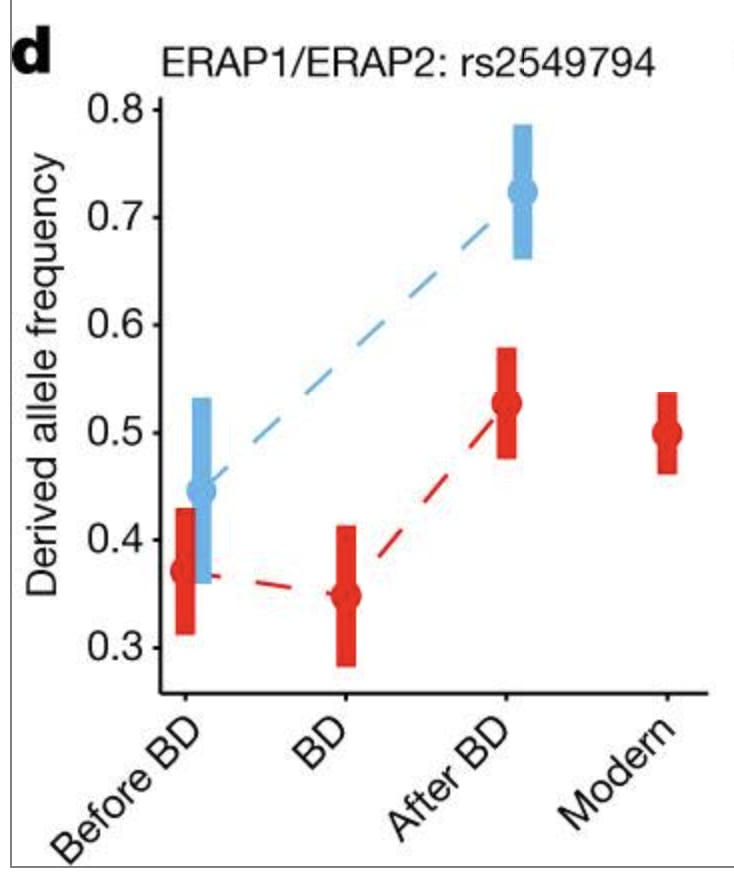 The studies on genes that have been protective against past plagues are kind of insane. There’s a genetic variant in the ERAP2 gene that jumped from 40% prevalence to 70% prevalence in ~100 years in Denmark thanks to its ability to reduce mortality from the bubonic plague.