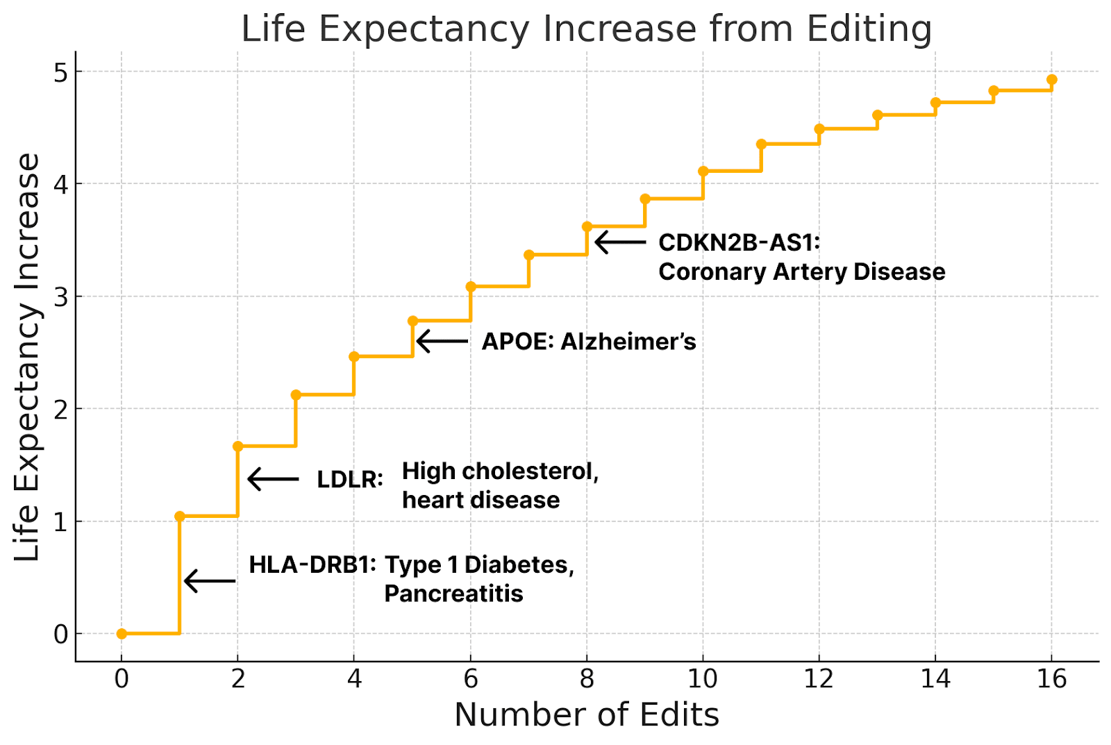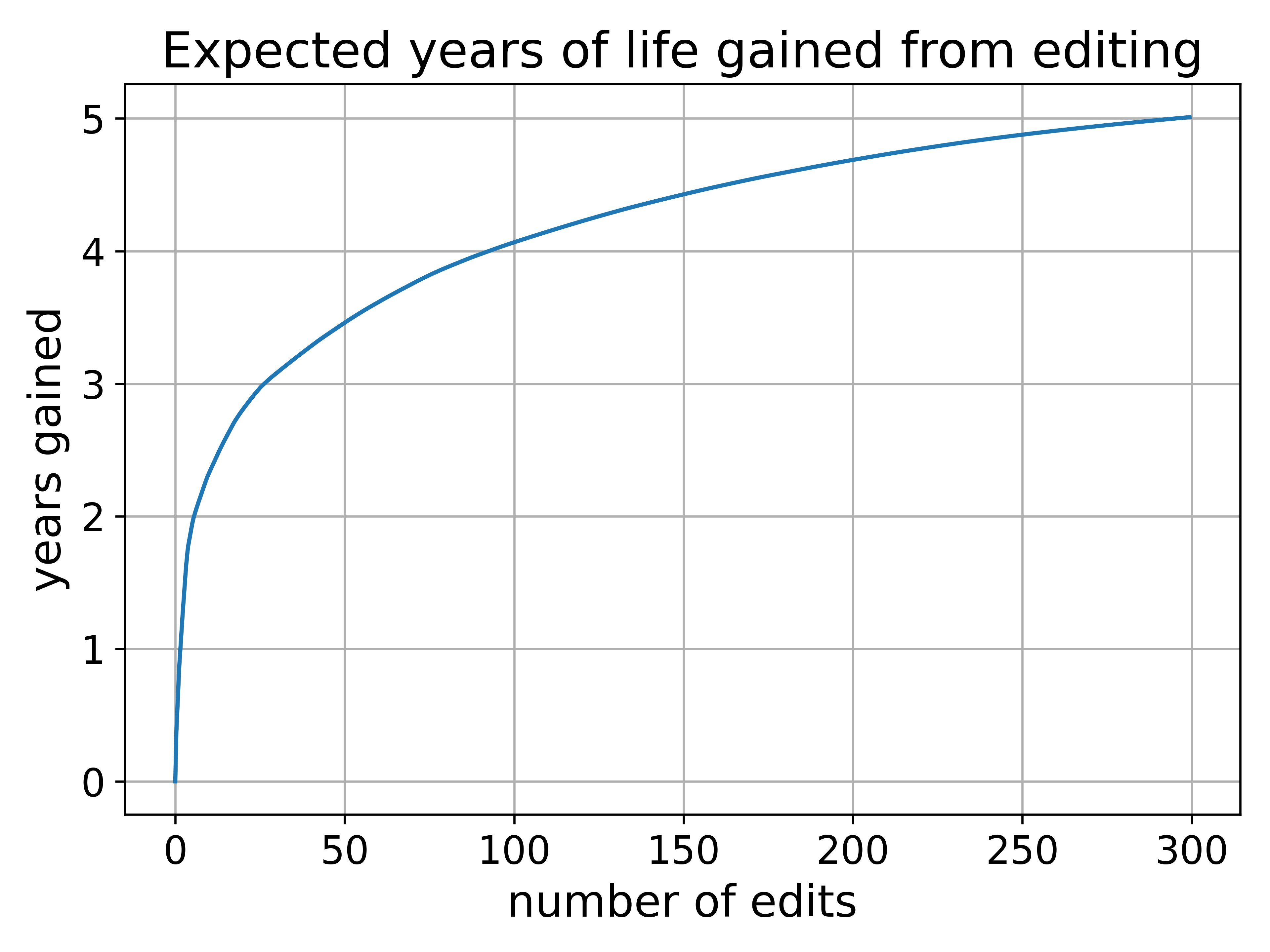 The life expectancy increase from editing also went down (by a factor of 3!). This was, to put it bluntly, a pretty dumb mistake on our part. The life expectancy GWAS study we used had a non-standard way of reporting effect sizes, and when we discovered and corrected this the effect size went down.