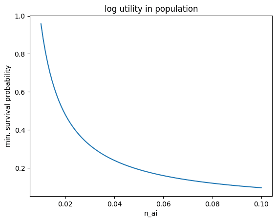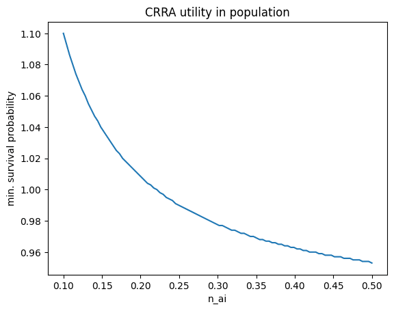 Put this way, we can immediately see a problem, which is that our approach takes risk linear in the population growth rate post-AI. That means that a high-enough n_ai would convince society to take suicidal levels of risk (even risks greater than 1, whatever that means). Even at n_ai=2%, the minimum survival probability is basically zero. Perhaps this is fine for a one-time decision if the benefits are high enough, but if we have to make repeated decisions on AI risk, this criteria ensures ruin.