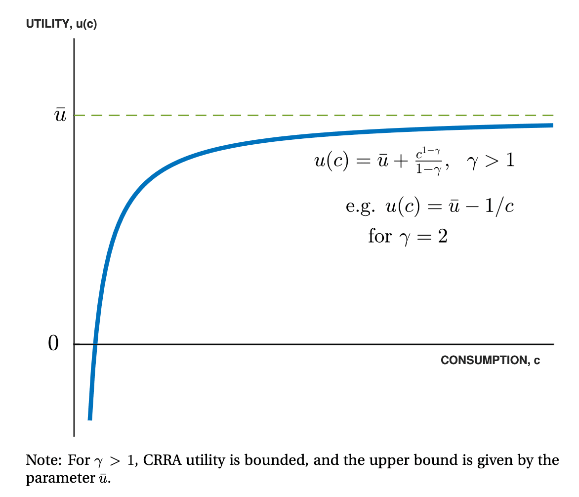To start, we’re going to jump directly to the more advanced model discussed in section 3. In this section, Jones assumes that individuals have CRRA utility functions with risk-aversion parameter greater than 1. This has the consequence that individual utility has an upper-bound regardless of how much they consume.