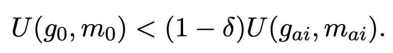 Okay, now let’s think about how we use this utility in our decisions. Today, we plod along with a certain growth rate (~2%) and mortality rate (~1%), call these g_0 and m_0. AI will presumably change both of these things to g_ai and m_ai. Perhaps, as Jones considers, AI will raise the growth rate to 10% and lower mortality to 0.5% (resulting in a 200 year lifespan). AI also presumably comes with a one-time existential risk delta. For this gamble to be worthwhile, the utility of a future with AI combined with the risk of dying has to be greater than the utility of today’s growth and mortality (the utility of dying has been set to zero):