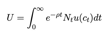 U(n,g)=∫∞0(nt+log(N0))⋅e−ρt⋅(¯¯¯u+11−γ⋅c0e(1−γ)gt))